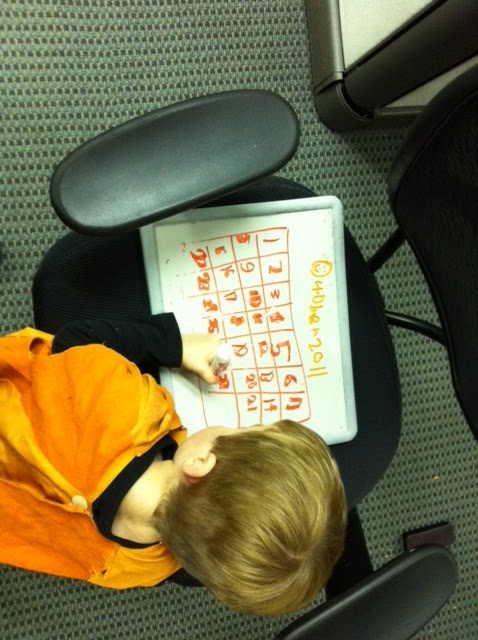 Connor was quite the social butterfly when he went around to the different offices and cubicles for treats. He talked to everyone about candy, autumn (yes, he uses that word instead of 'fall'), calendars, etc. He was quite concerned with one group who had the word "October" written on a white board, but instead of the calendar dates they had a bunch of mathematical symbols written. He wanted them to erase it and write the calendar in its place!